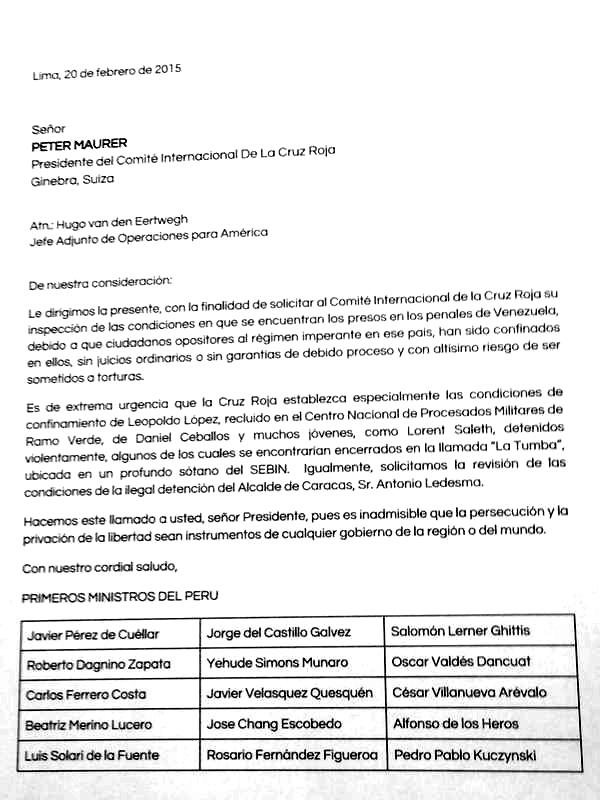 Hoy, los cuatro ex “primeros ministros” que firmaron la Carta Abierta del 18 de agosto de 2014 han logrado —contra el pueblo bolivariano— reunir a once más, cuatro de ellos apristas, dos oportunistas ligados a su segundo gobierno, un exfujimorista y cuatro empresarios de derecha. ¿A quiénes representan los coordinadores de estas cartitas? Pues Pérez de Cuéllar a los Estados Unidos; Kuczynski, al capital transnacional; Merino, al gran empresariado nacional; y Solari, al sector más retrógrado de la Iglesia católica en el Perú. Ahora junto a las mafias alanistas y fujimoristas y a los oportunistas de siempre, se unen contra el pueblo revolucionario y socialista de Venezuela y el legítimo gobierno de Nicolás Maduro como cruzados medioevales.